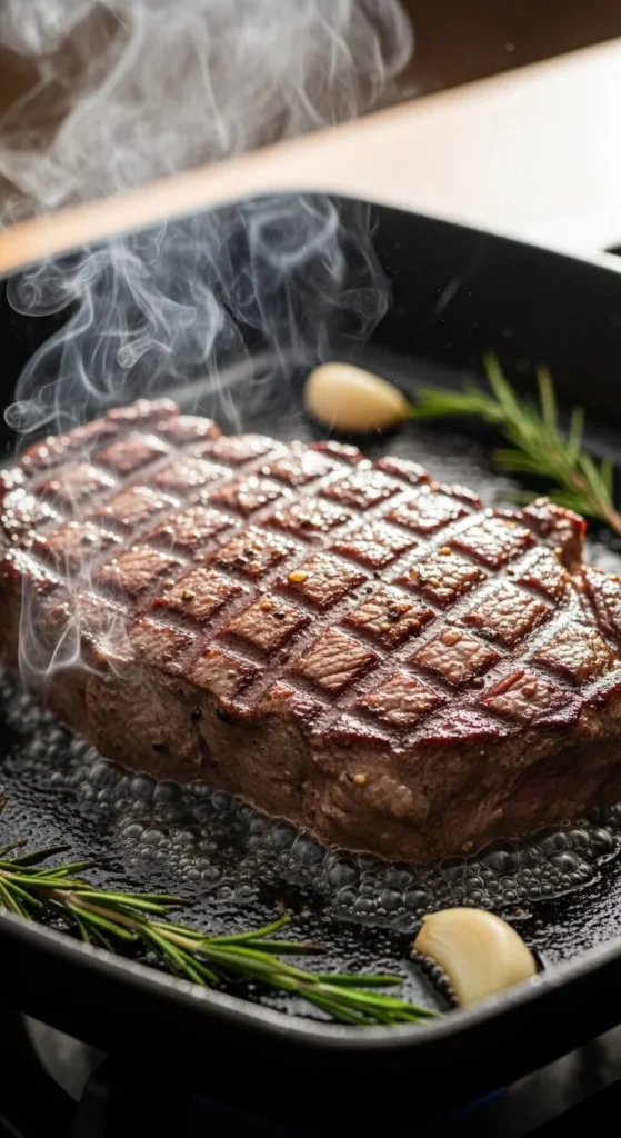 You should hear a strong sizzle immediately. That sound means the crust is forming. If you keep shifting the steak, you’ll ruin it.