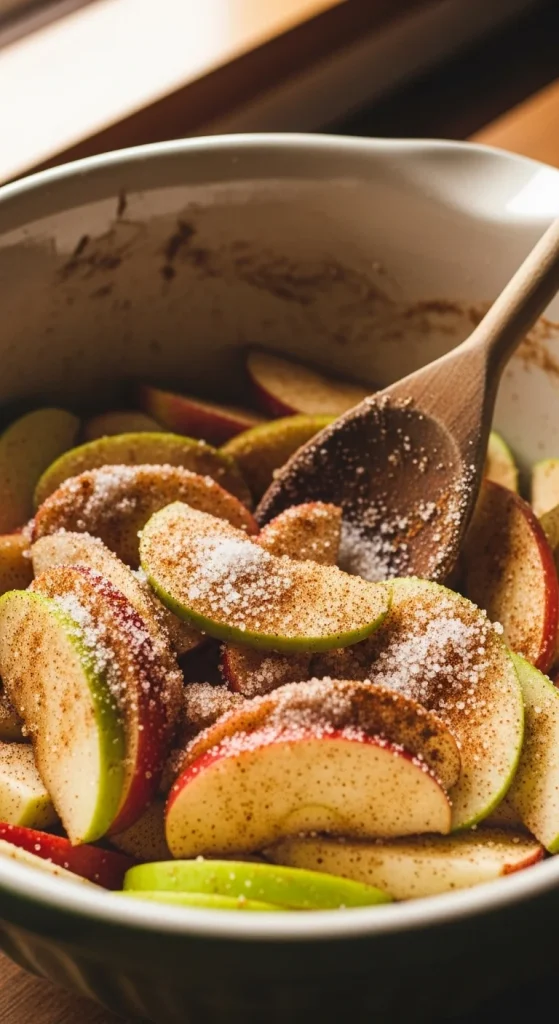 - Let it sit for 10–15 minutes — the apples will release some juice, which helps create that syrupy filling later.