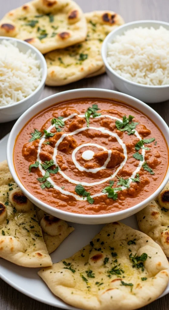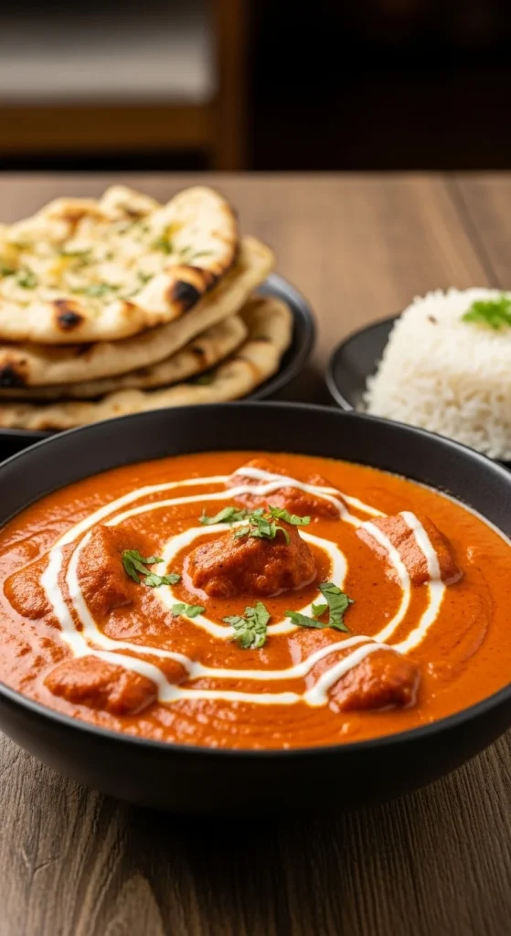 Butter chicken is all about that final presentation — a swirl of cream, a sprinkle of herbs, and a side of something to scoop it up with.