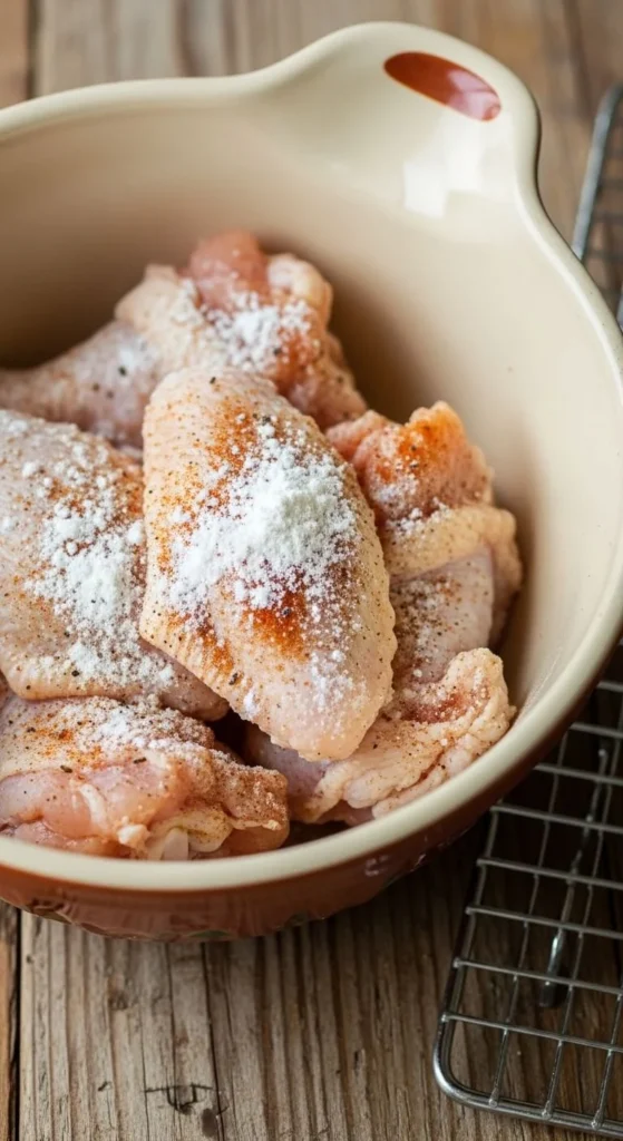A light coating of baking powder (not baking soda) helps break down proteins in the skin, creating a crispier texture.