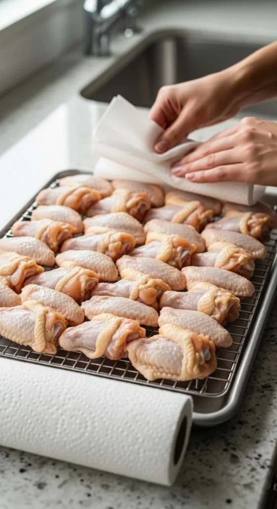 Before seasoning or cooking, pat the wings completely dry using paper towels.