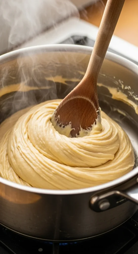 Pro Tip: If the dough looks greasy or separates, it’s probably too hot — let it cool a bit more before adding eggs.