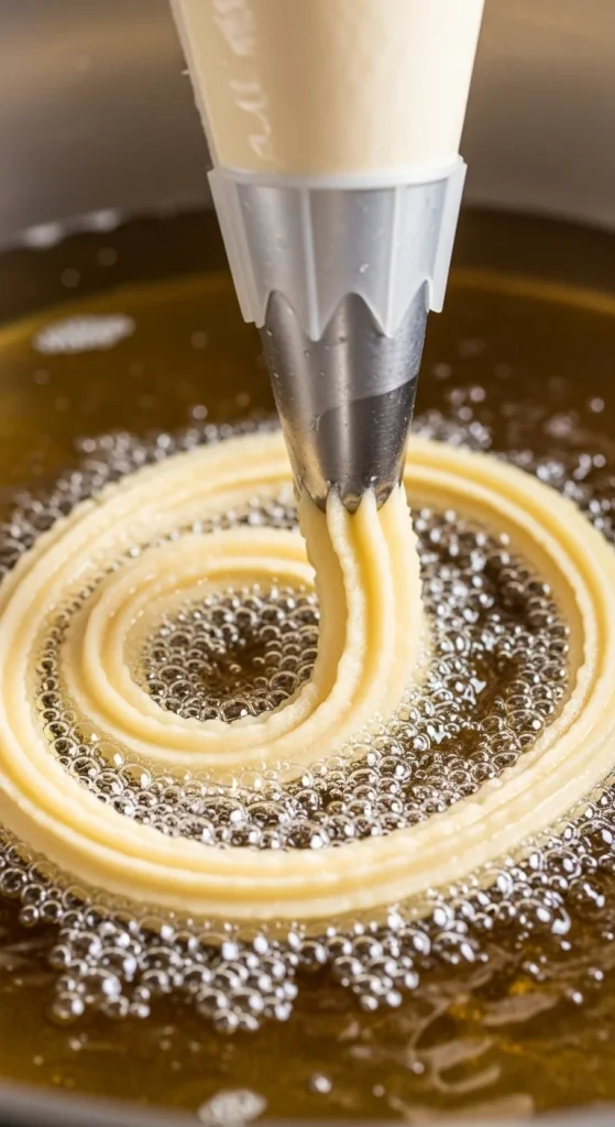 - Pipe 4–6-inch strips of dough directly into the hot oil, using scissors or a knife to cut them off.