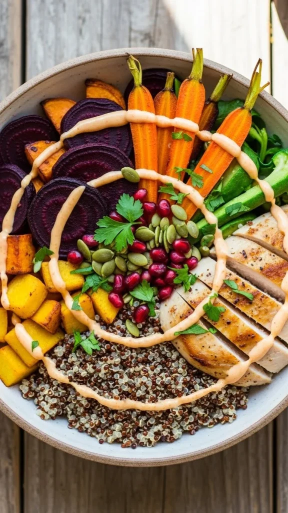 • Quinoa bowl with roasted veggies, grilled chicken, and tahini