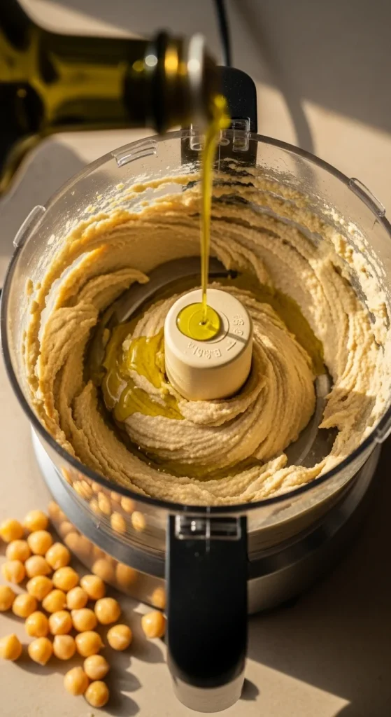 Once your chickpeas are soft and ready, it’s time to blend. Add tahini, lemon juice, and garlic to your food processor first. Blend for about 30 seconds — this aerates the tahini and builds a creamy base.