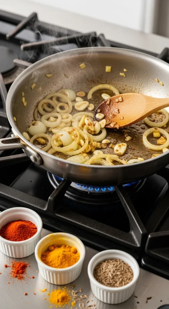 Next, toss in the chopped onions, garlic, and ginger. Sauté for about 3–4 minutes until the onions turn golden and fragrant.