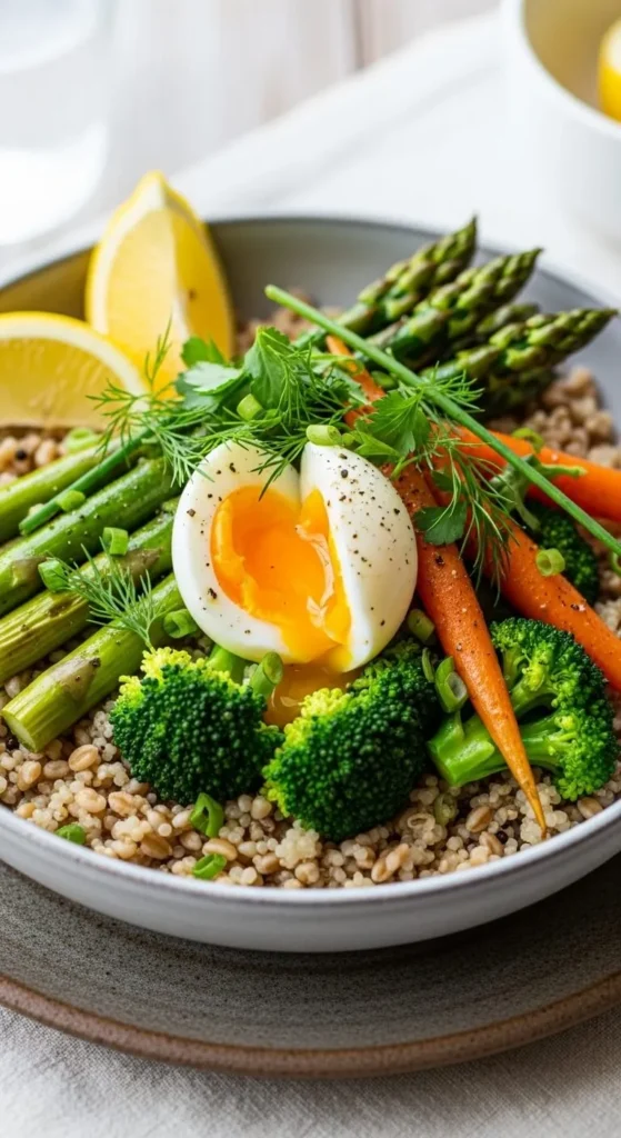 - Asparagus: Roasted with lemon + served over quinoa with a fried egg