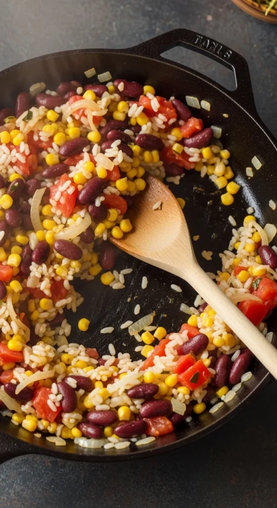 - Add veggies, beans, and spices; cook for 5 minutes.