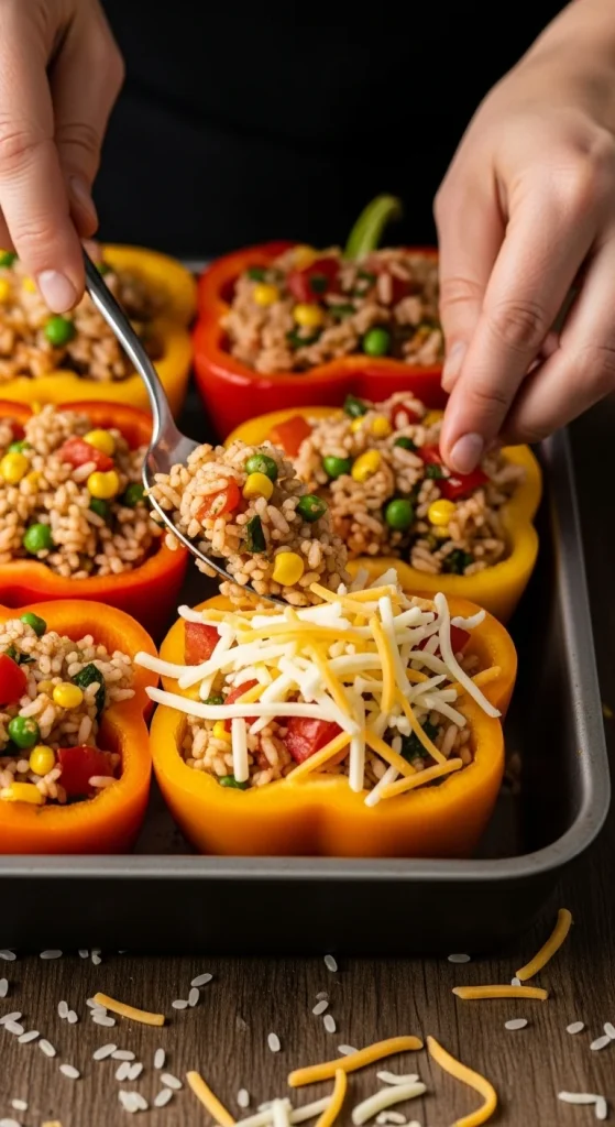 Spoon the mixture into each pepper until it’s just below the top. Don’t pack it too tightly, as the filling will expand a little when baked.