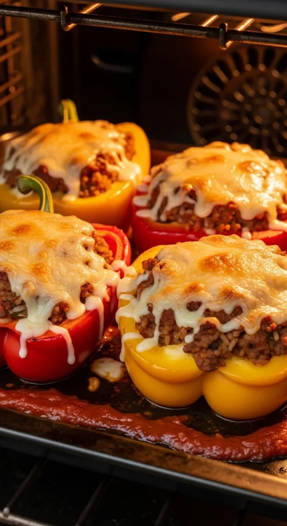 Bake at 375°F (190°C) for about 35–40 minutes, until the peppers are tender but not falling apart. For the last 10 minutes, remove the foil to brown the cheese on top.