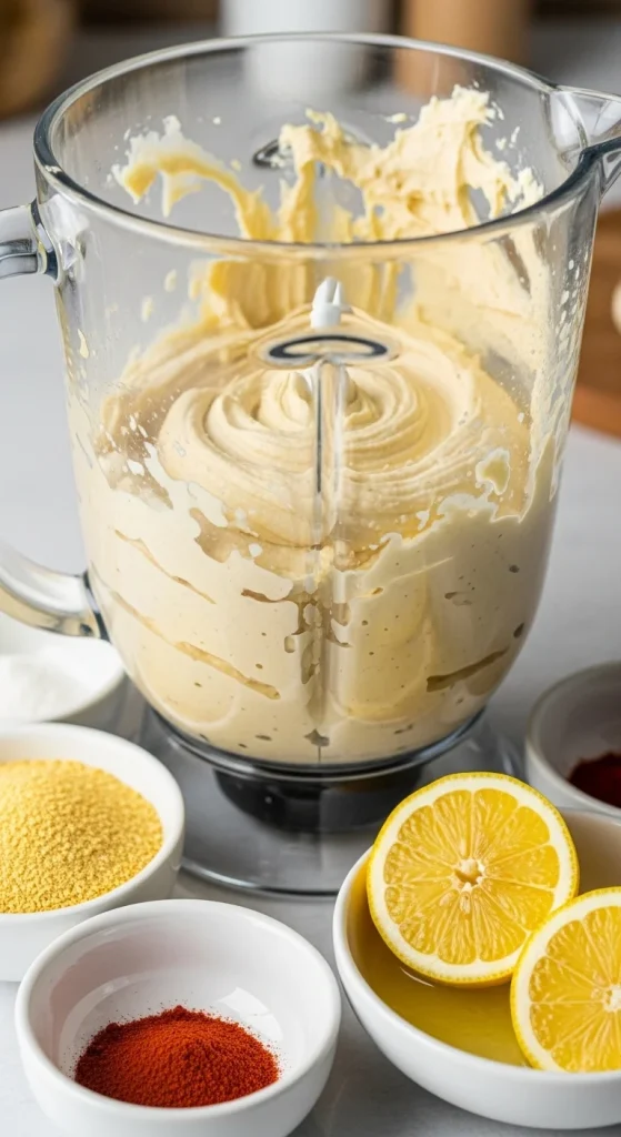 Blend everything together with a splash of water or non-dairy milk until smooth and velvety. The mixture should taste slightly saltier and tangier than you want — it mellows as it sets.