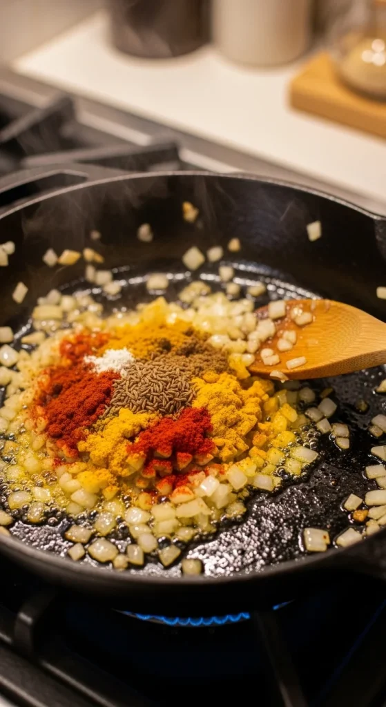 • A bold spice blend: Cumin, turmeric, coriander, and garam masala are your best friends.