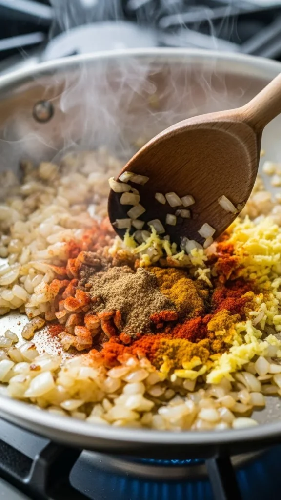Cook gently in oil or ghee over medium heat. Let the onions soften and turn lightly golden. This step sets the tone for the entire curry.