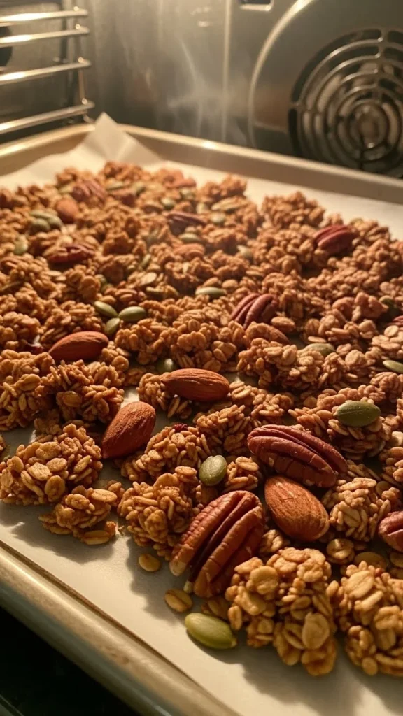 The kitchen should start smelling warm and spiced before the granola looks done.