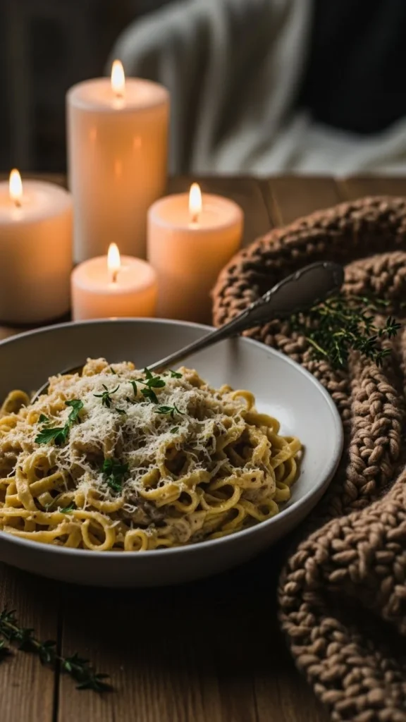 Creamy pasta feels even cozier when the environment matches the meal.
