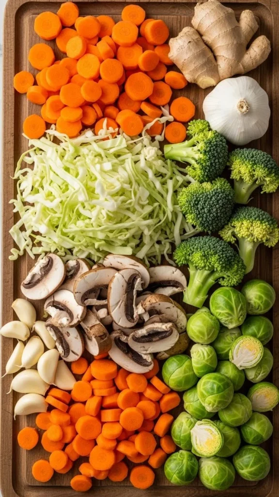 3. Add hearty veggies first: carrots, broccoli, cabbage.