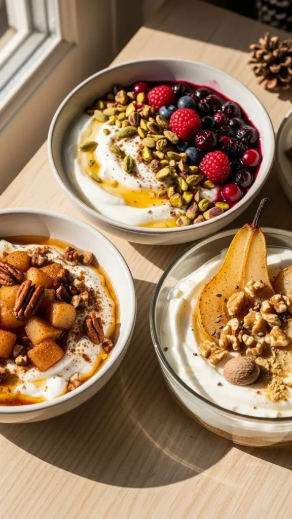 Winter yogurt bowls don’t need to be cold to be refreshing. With warm fruit, gentle spices, and balanced toppings, they become nourishing, comforting meals that fit perfectly into colder days.
