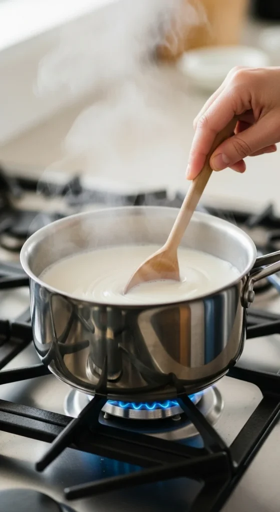 Pour your milk into a clean saucepan. Heat it slowly over medium flame until it reaches 180°F (82°C) — just before boiling. This step helps kill unwanted bacteria and changes the milk proteins so your yogurt sets thick and smooth.
