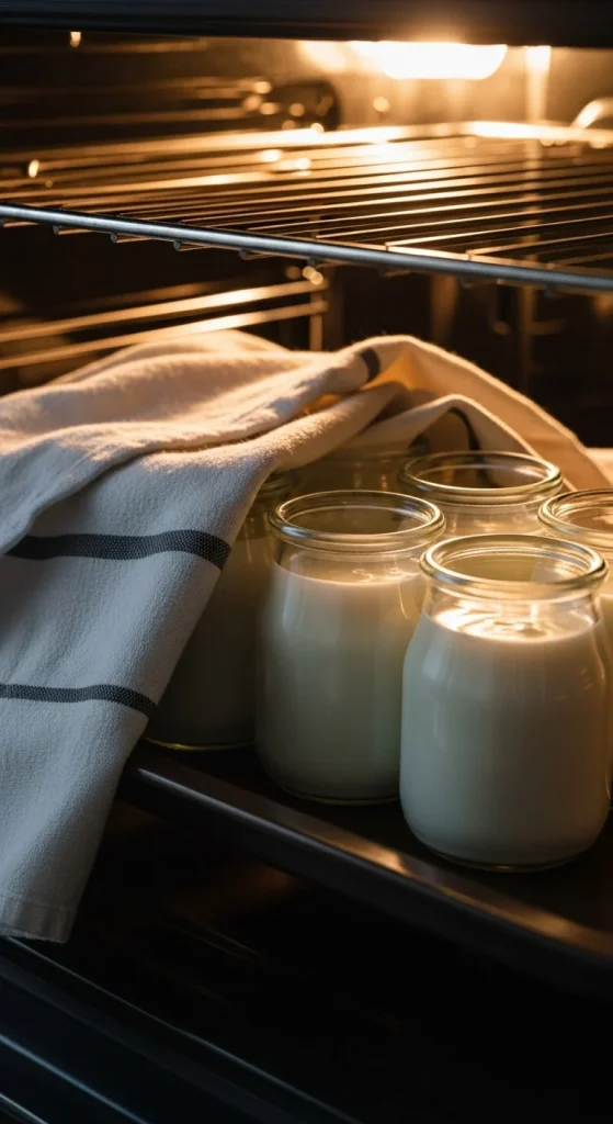 - Wrap the jars in a towel and place them in your oven with the light on.