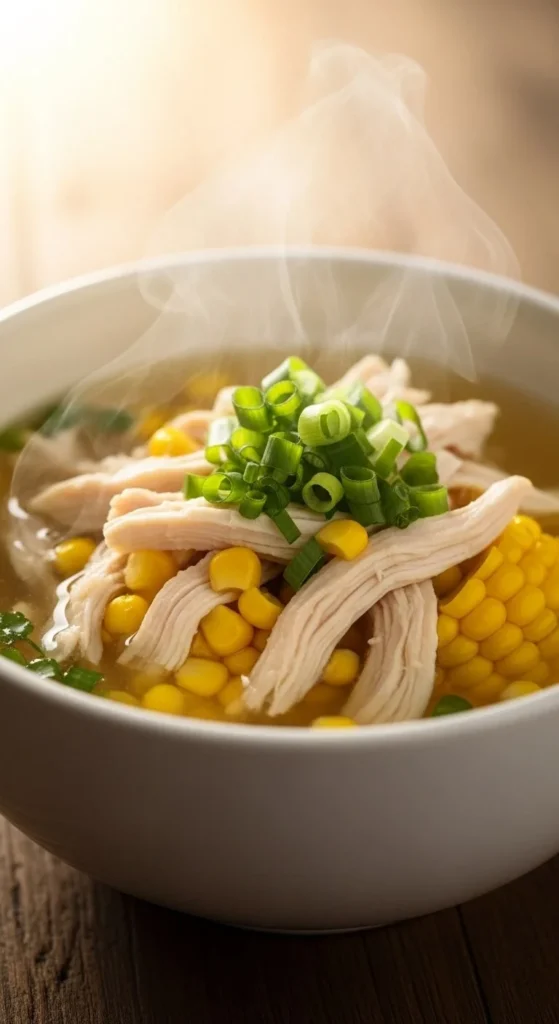 Simmer shredded chicken in broth with corn and ginger.