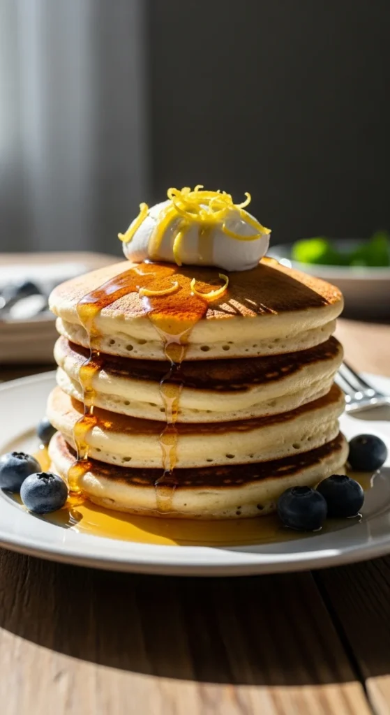 Ricotta adds softness without extra effort. Mix it into basic pancake batter with lemon zest. Cook slowly so the centres stay tender. These pancakes hold their shape and stack well, which helps with serving guests.
