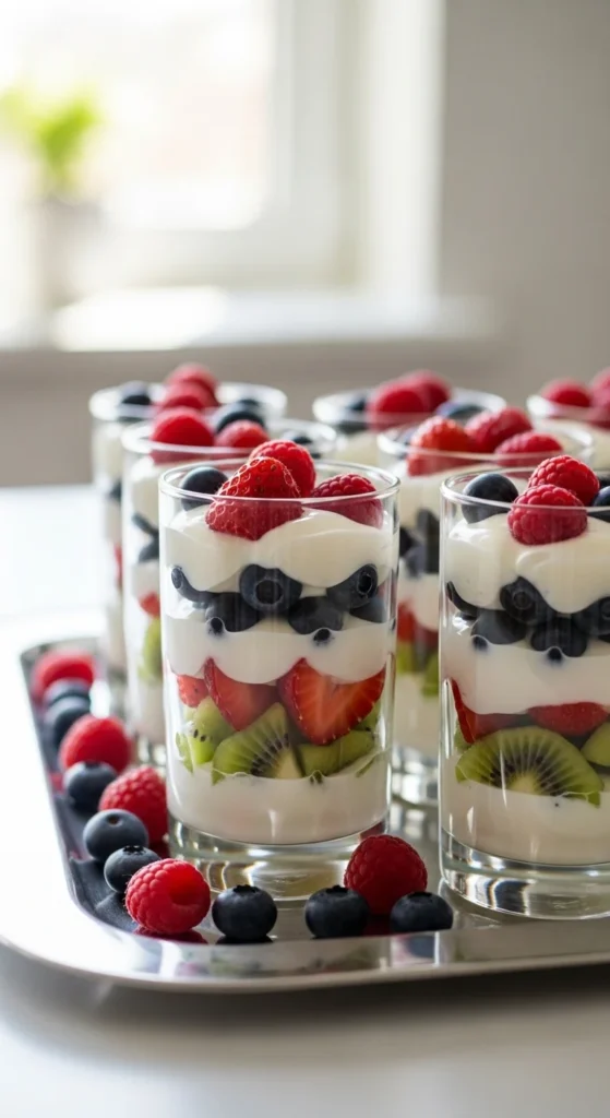 Layer yogurt with fruit in clear glasses. Simple layers look polished.