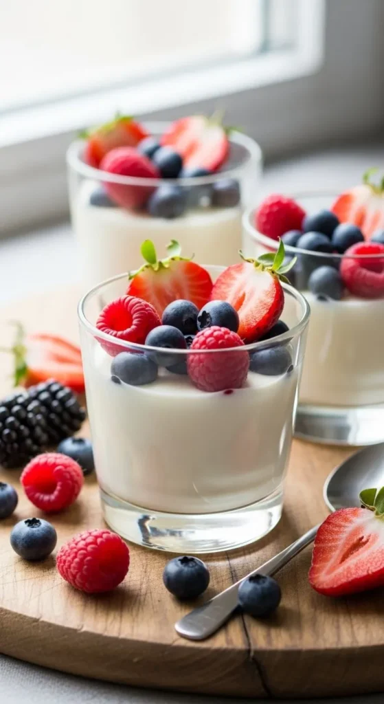 Top with berries or fruit sauce. Serve chilled. Use clear glasses for presentation. Add a drizzle of honey if desired. Keep refrigerated.