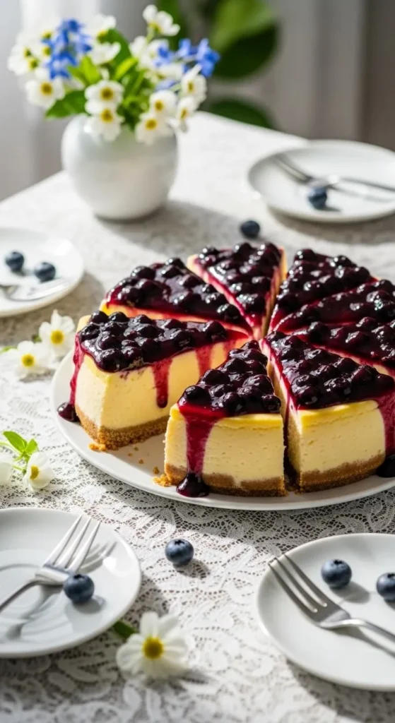 Top with blueberry sauce just before serving. Slice with a warm knife. Serve chilled. Add lemon zest for color. Store refrigerated.