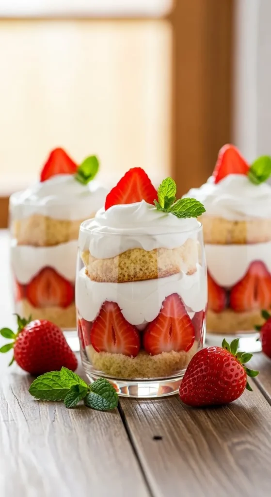 - Layer cake, cream, and strawberries.
