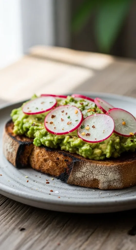 This toast feels crisp, creamy, and fresh. Radishes add crunch and color, while avocado keeps it smooth. It comes together quickly and suits lighter mornings.