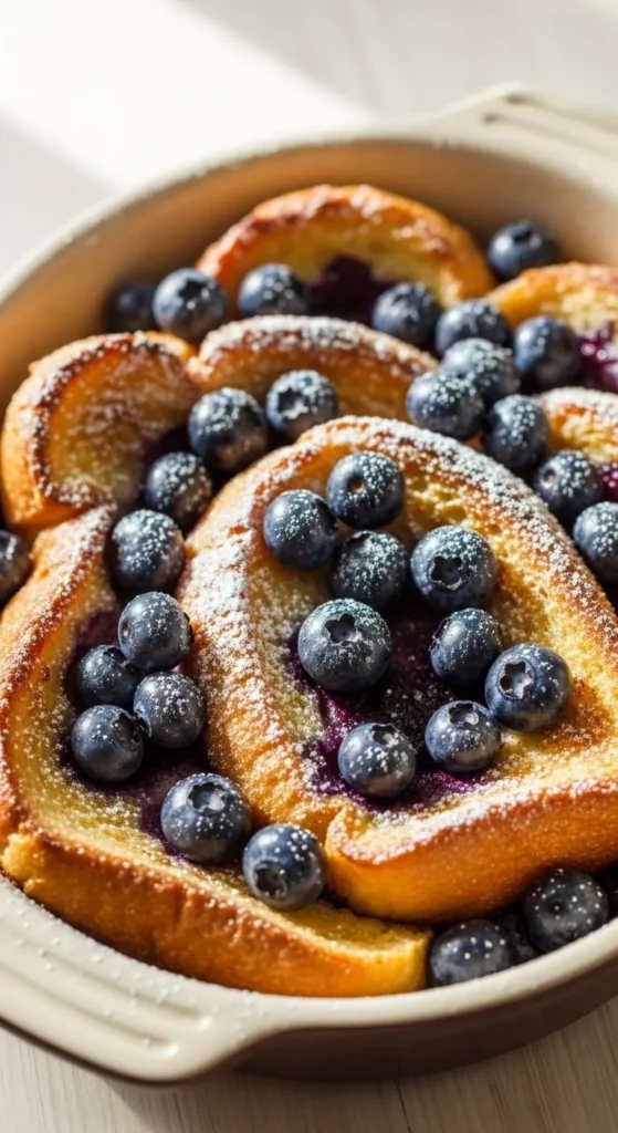 This baked version is perfect for sharing. Blueberries soften while baking and add bursts of flavor. The inside stays custardy, while the top turns lightly crisp.