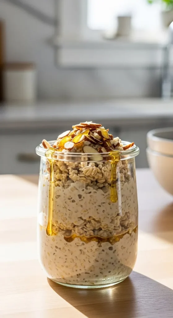 Overnight oats save time and feel gentle on the stomach. Almonds add crunch, while honey gives a mild sweetness that suits spring mornings. The texture stays creamy without cooking.