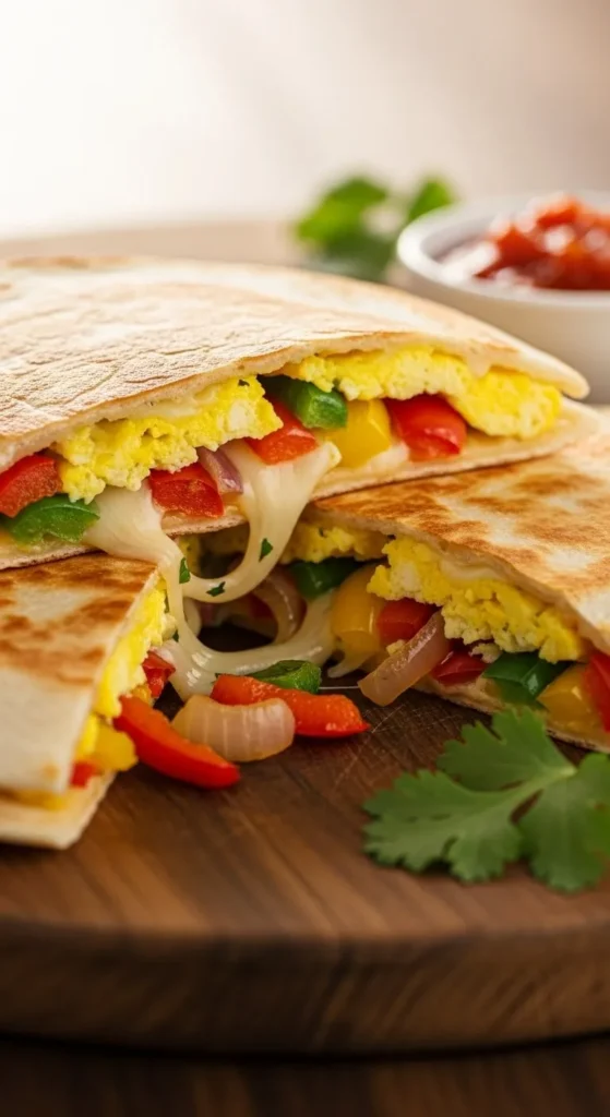 This quesadilla feels savory and filling. Eggs and vegetables cook together quickly and stay balanced.