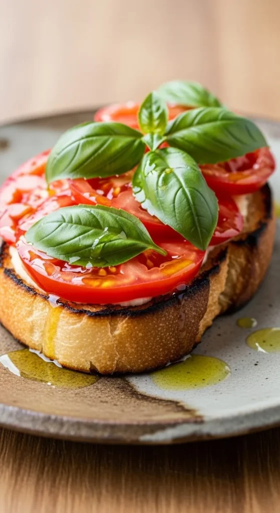 This toast feels fresh and balanced. Tomatoes bring juiciness, while basil adds aroma.