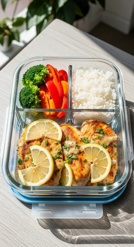 This bowl works because every part holds well in the fridge. Roast chicken thighs with lemon and garlic. Cook a big pot of rice or farro. Add simple vegetables like carrots or broccoli. Store everything separately so textures stay right.