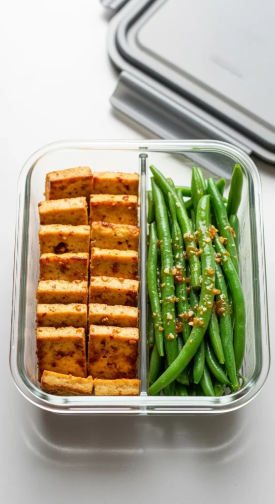 Tofu stays affordable and reheats evenly. Press tofu first for better texture.