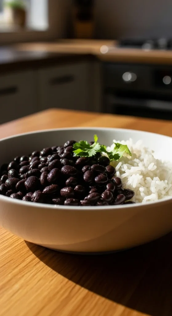 Cook rice and beans together or separately. Portion evenly.
