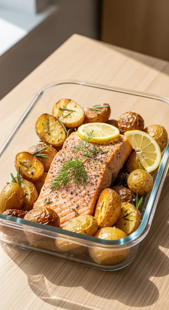 Frozen salmon helps control cost. Potatoes stay firm after reheating. Add greens later so they stay crisp. This prep works well for busy weeks.