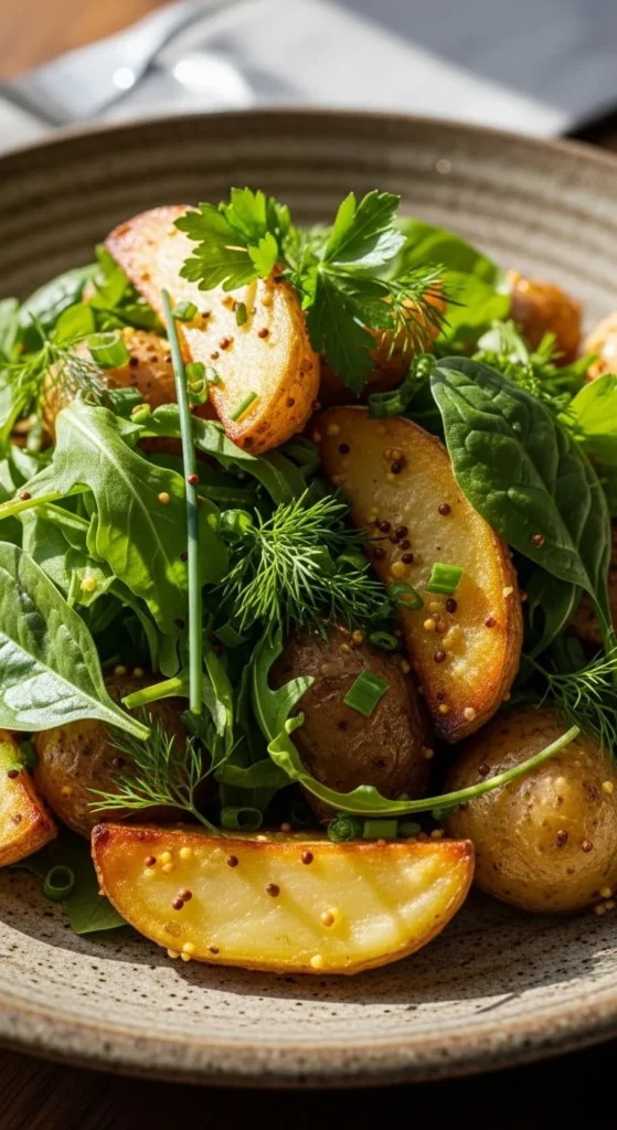 Boiled potatoes mixed with greens create balance. Dress while warm so flavors soak in.
