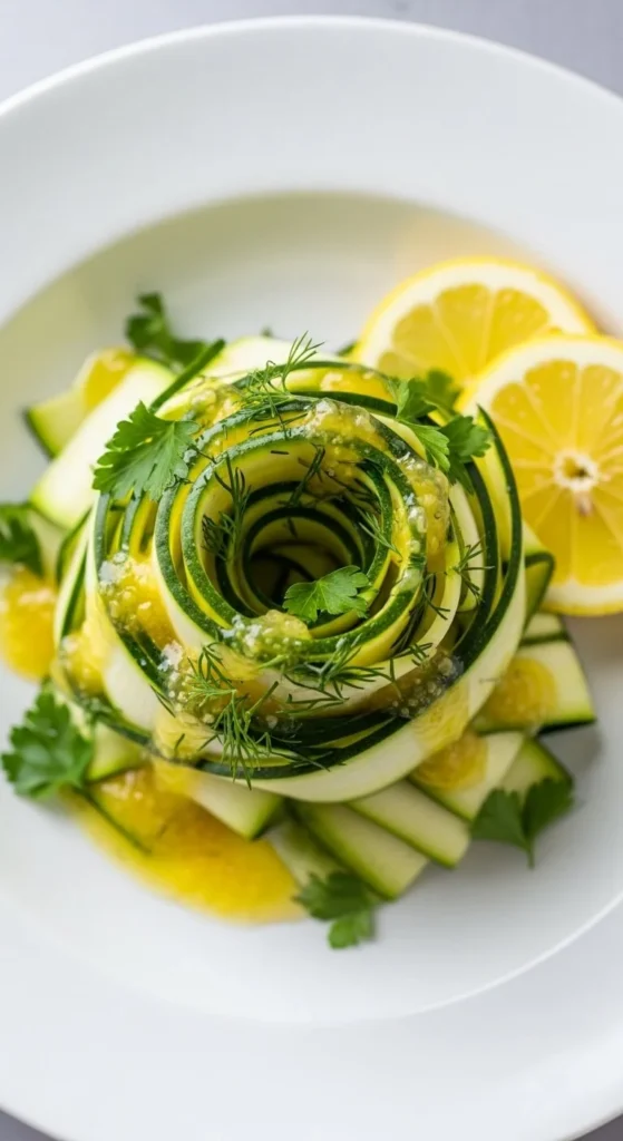 Slice zucchini thin. Toss with lemon and oil. Add herbs.