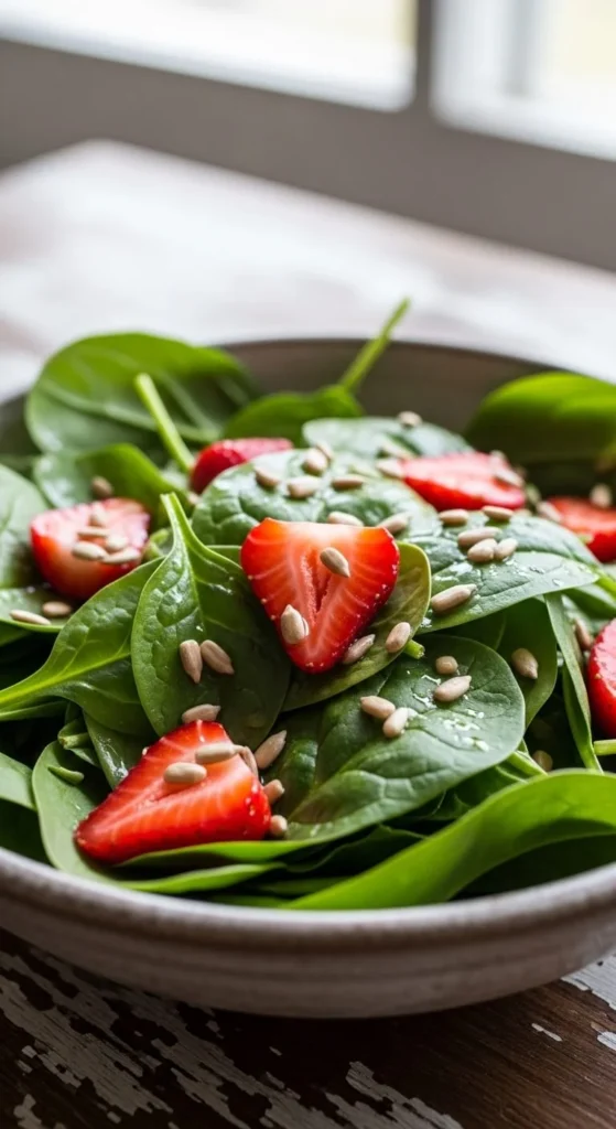 Sweet strawberries balance spinach perfectly. Use baby spinach as a base. Add sliced strawberries and a handful of sunflower seeds for crunch. A simple vinegar and oil dressing is enough. No sweeteners required.