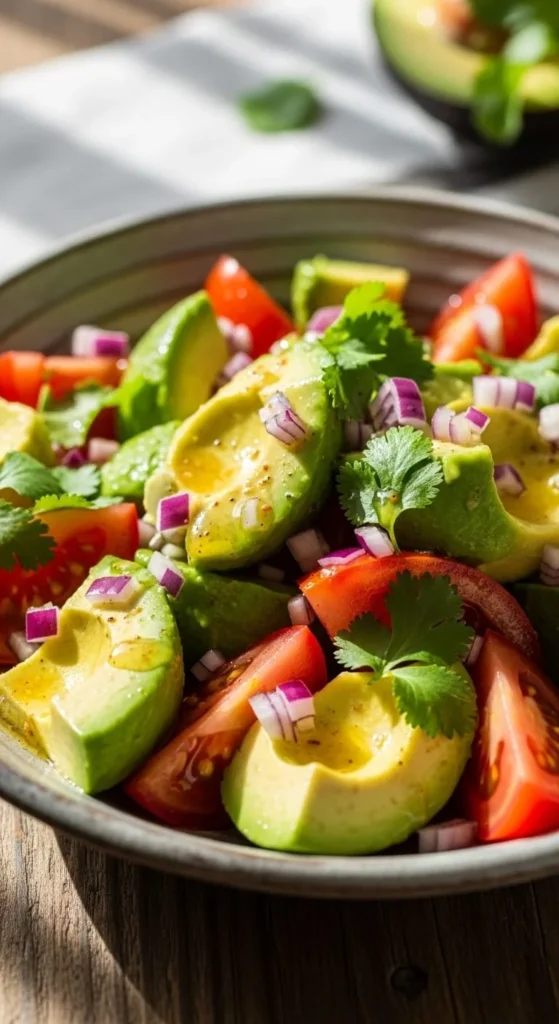 Chopped tomatoes and avocado need very little help. Lime or lemon juice keeps avocado from browning. Salt lightly.