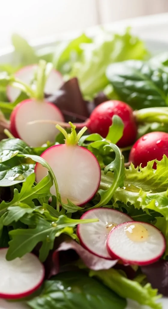 Radishes bring crunch and color. Slice thin and toss with greens. A simple dressing keeps flavors clean.