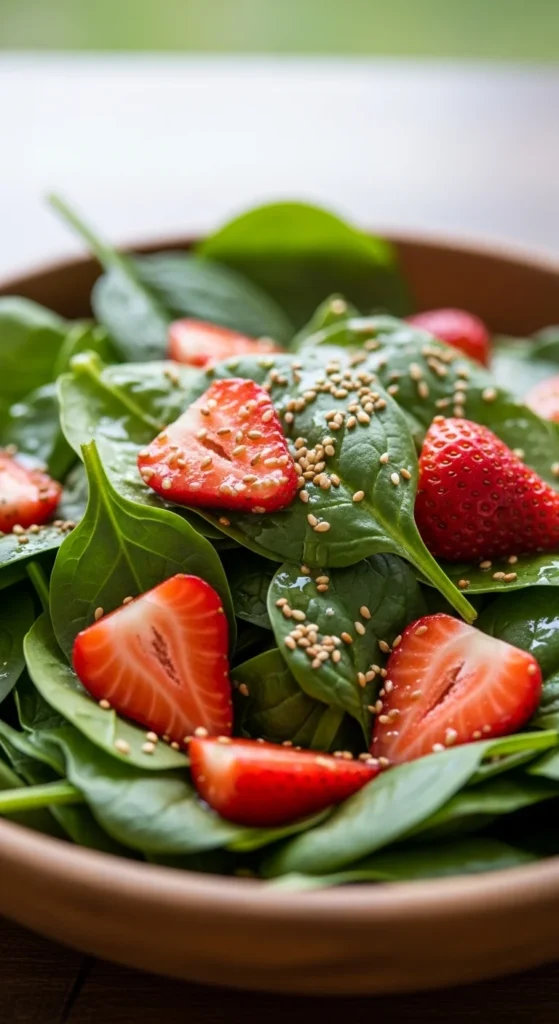 This salad balances sweet and savory without extra effort. Use spinach as the base. Slice strawberries thin. Add sunflower seeds or peanuts for crunch.