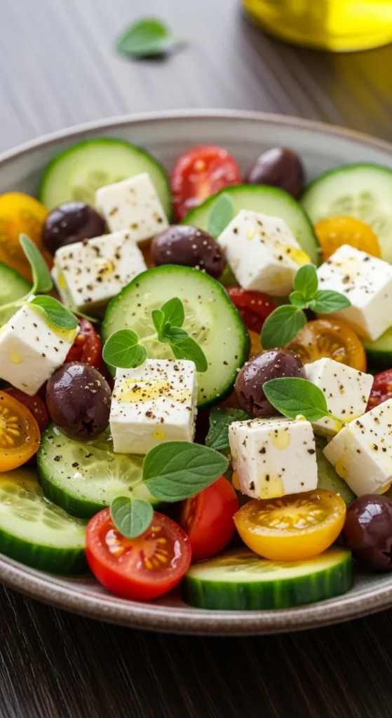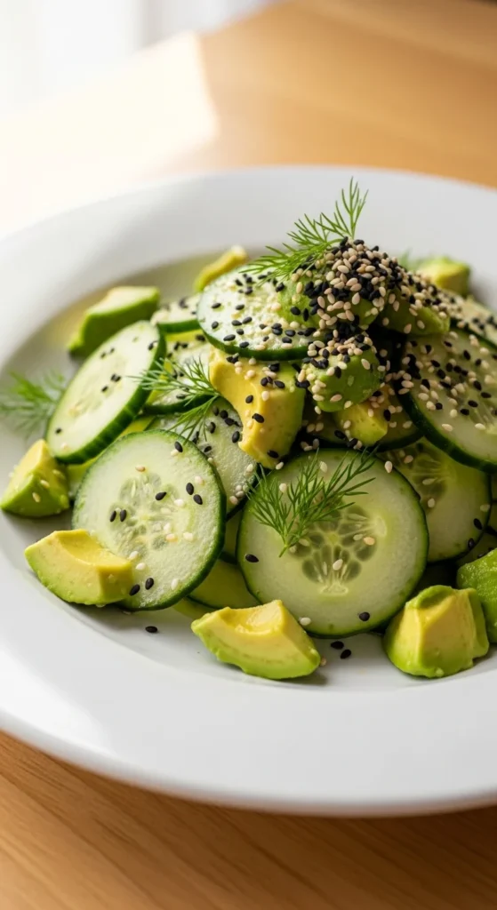 Cucumbers keep this bowl crisp and cooling. Avocado adds texture. Slice both. Add salt and oil. Sprinkle seeds if you have them.