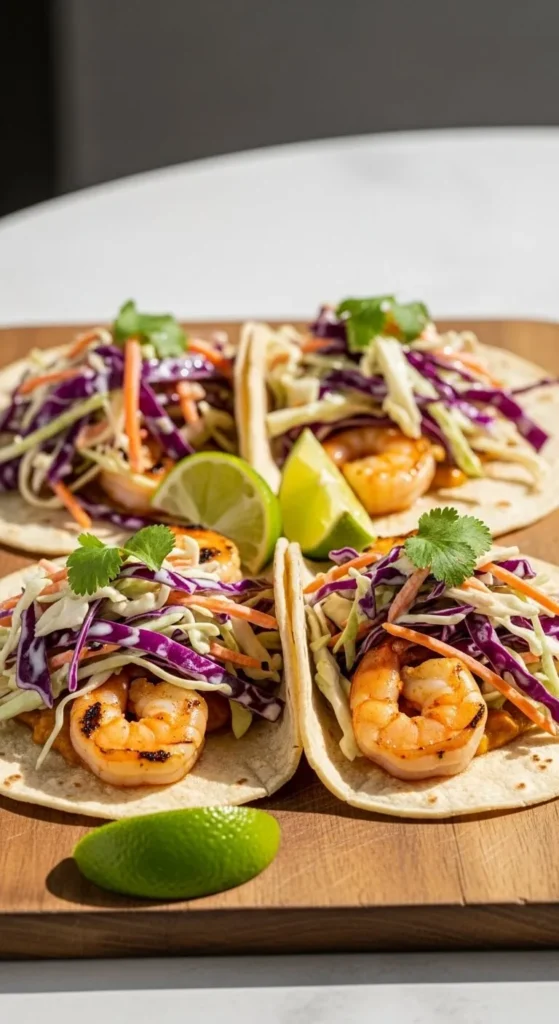 - Fill shells with shrimp and slaw.