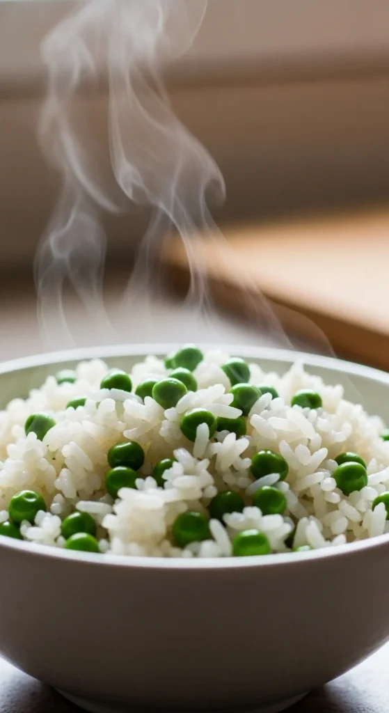 Cook rice. Stir in peas at the end.