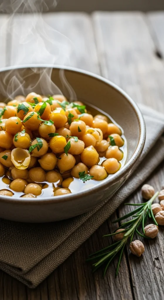 Heat chickpeas. Add oil, salt, and herbs.