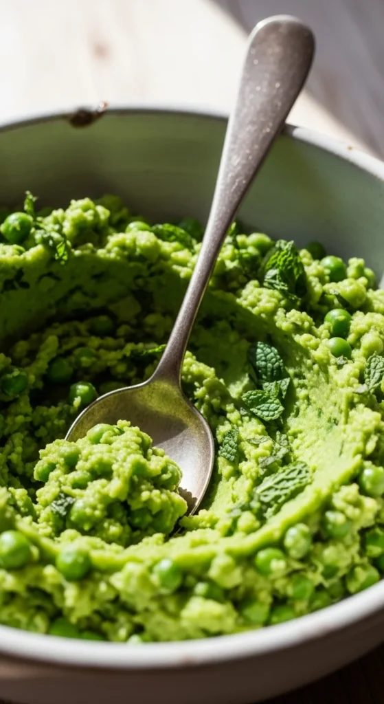 Frozen peas cook in minutes. Boil briefly. Drain. Mash with butter, salt, and chopped mint. The result stays smooth and light.