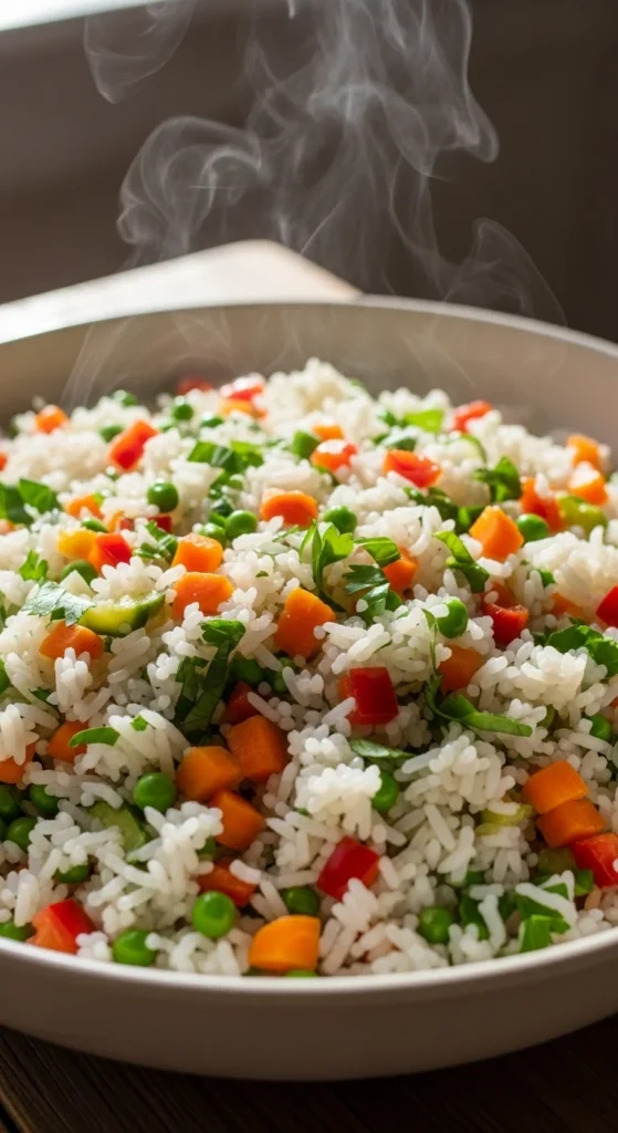 Cook rice as usual. Stir in chopped vegetables and herbs at the end. The heat softens everything gently.